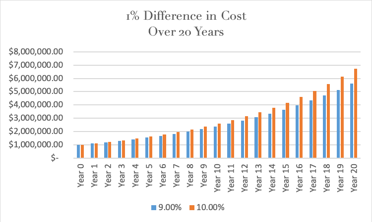 Investment expenses matter and can have a significant effect on investment performance over the long-term. A one percent lower cost investment portfolio, could result in a $1 million gain or more for the client over a 20-year period!